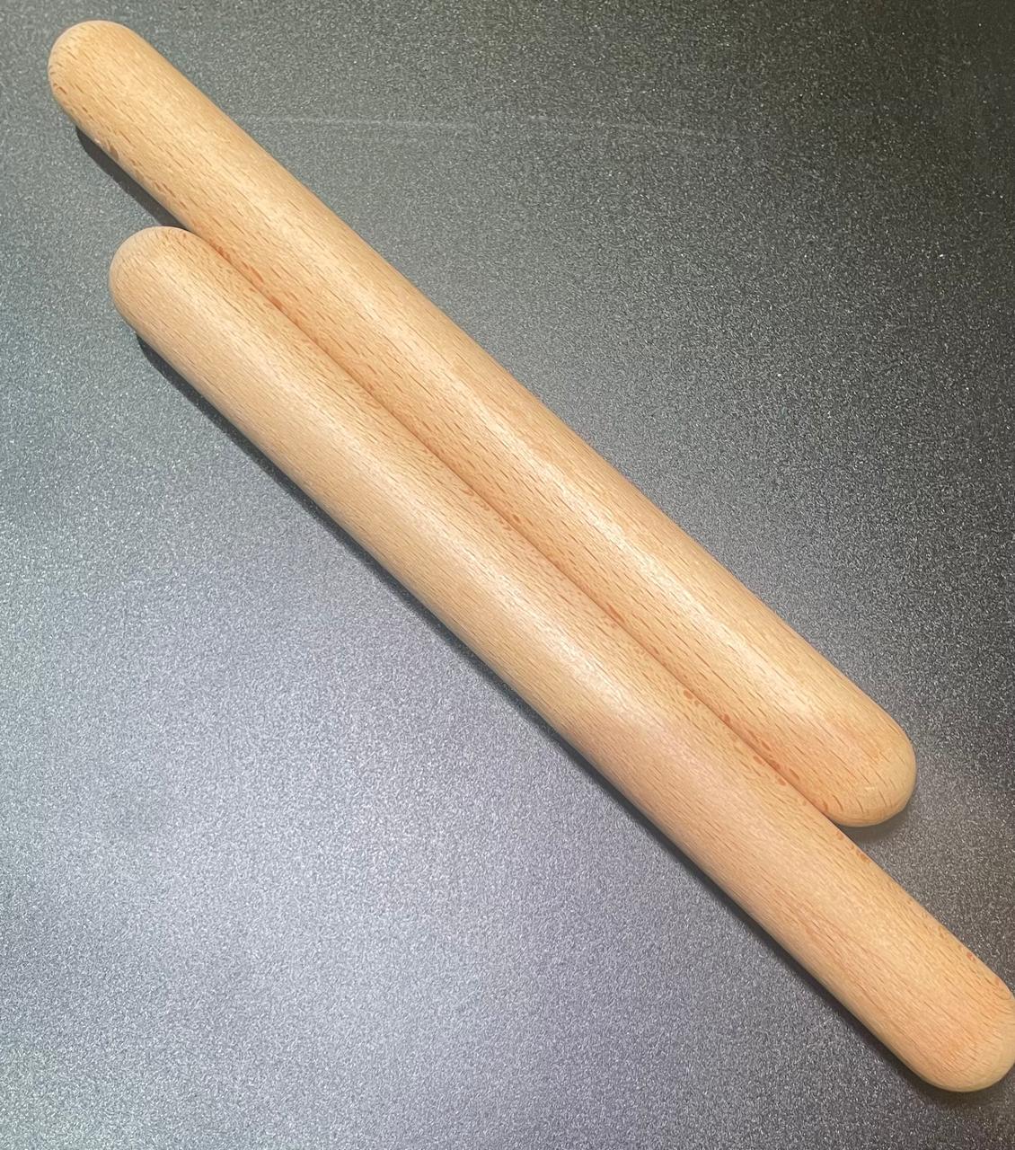 Two cylindrical hardwood sticks struck together to produce sharp, penetrating click sounds essential in Latin rhythms. Solid construction with smooth lacquered finish provides consistent tone and durability for repetitive striking motions. Simple design allows for various grip positions and striking angles to create different tonal qualities.