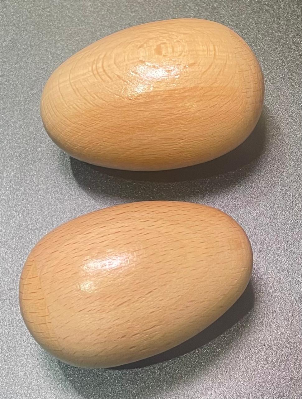 Egg-shaped wooden shakers filled with small beads or seeds that create rhythmic rattling sounds when shaken. Hollow carved hardwood construction with sealed chambers provides controlled sound volume and consistent tone quality. Ergonomic oval shape fits comfortably in hand allowing for various shaking techniques and dynamic control in percussion arrangements.