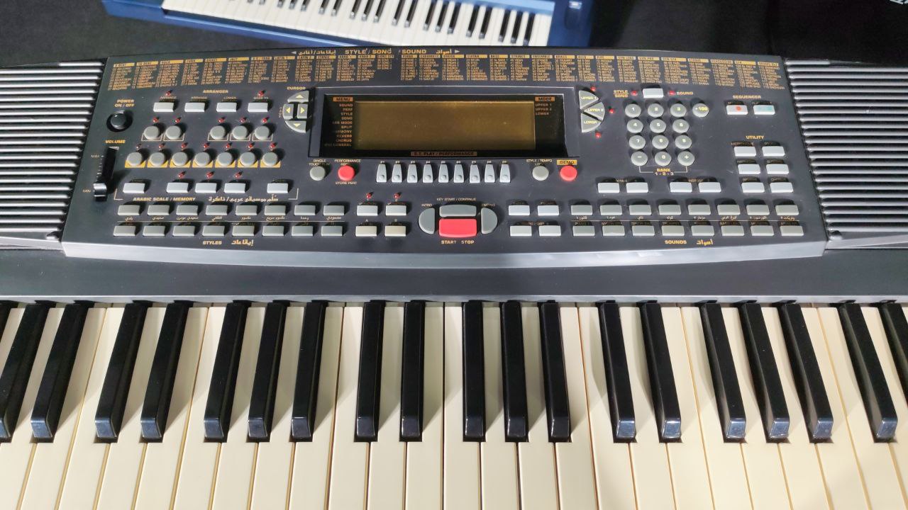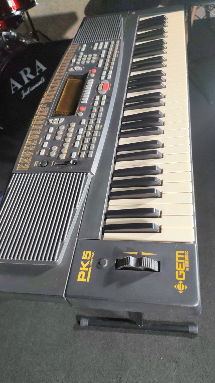 Used like new, the Gem PK5 Oriental keyboard features 61 velocity-sensitive keys with 256 PCM sounds including 8 drum kits and 32-note polyphony. It offers specialized Oriental styles with Arabic scale support, programmable split functionality, 22 reverb/chorus types, 8 harmony types, sequencer capabilities, and MIDI compatibility.