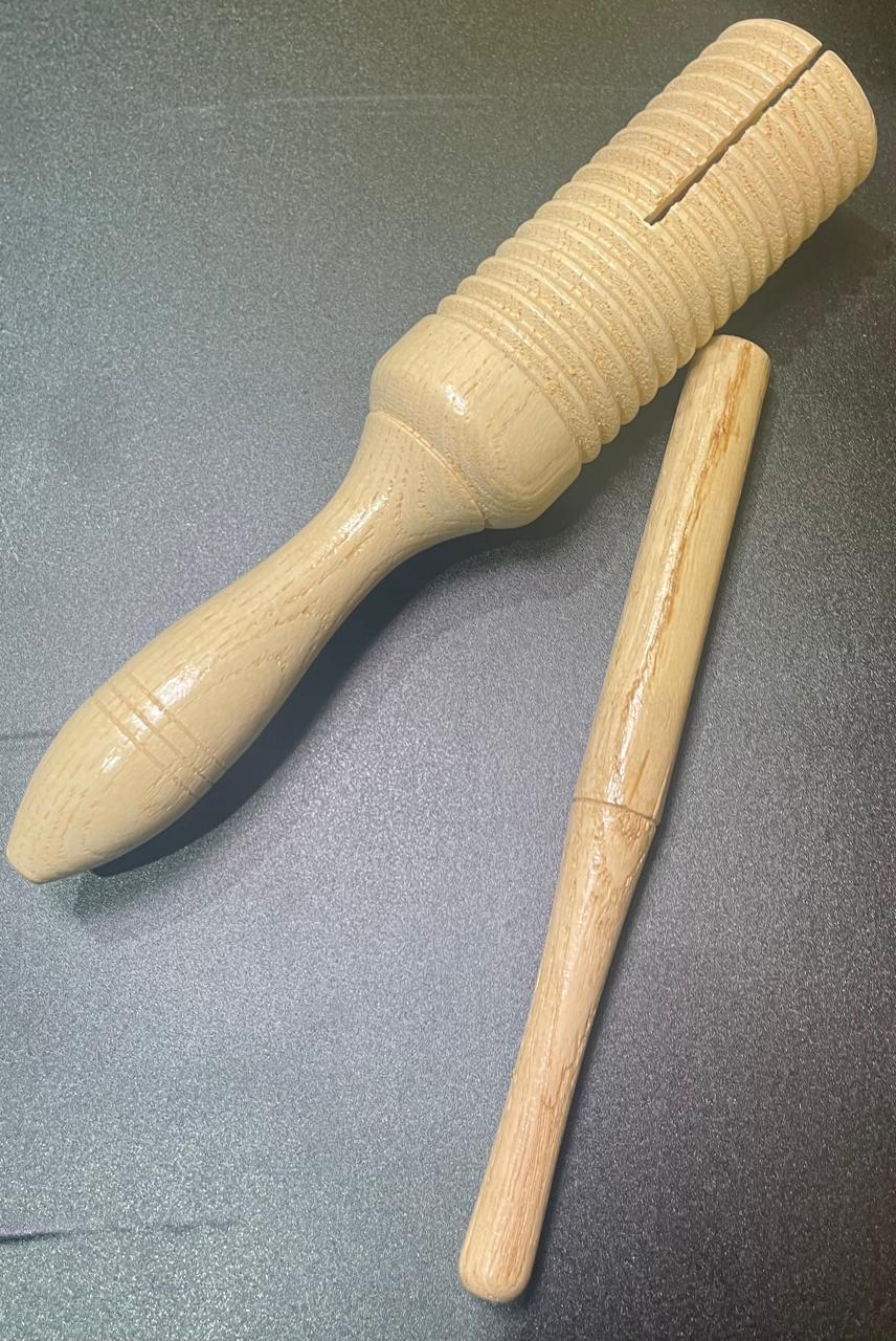 Ridged wooden percussion instrument played by scraping the grooved surface with accompanying wooden stick to create rasping sounds. Carved hollow body amplifies the scraping texture while lacquered finish ensures smooth stick movement across ridges. Variable scraping speed and pressure techniques produce different rhythmic patterns and dynamic effects.