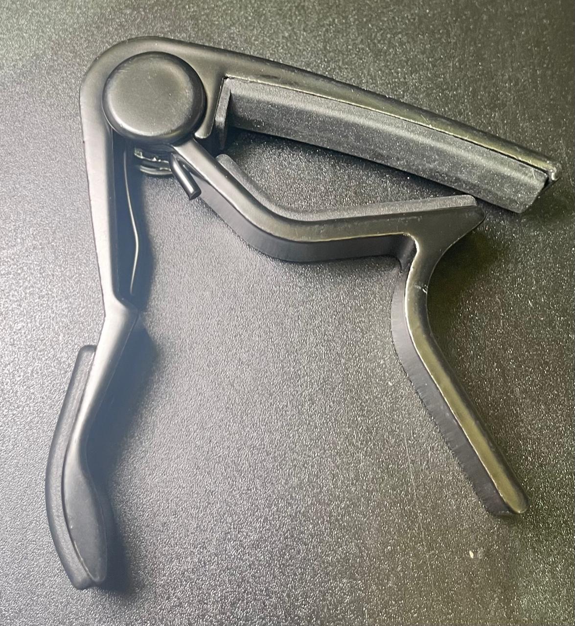 Spring-loaded guitar capo with ergonomic design for quick and easy string clamping. Provides even pressure across all strings without buzzing. Suitable for acoustic and electric guitars. Durable metal construction with comfortable grip handle.