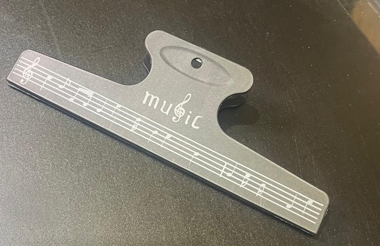 Decorative paper clip designed with musical staff lines and "music" text. Perfect for organizing sheet music, holding music pages, or as a bookmark for music books. Functional stationery item with musical aesthetic appeal.