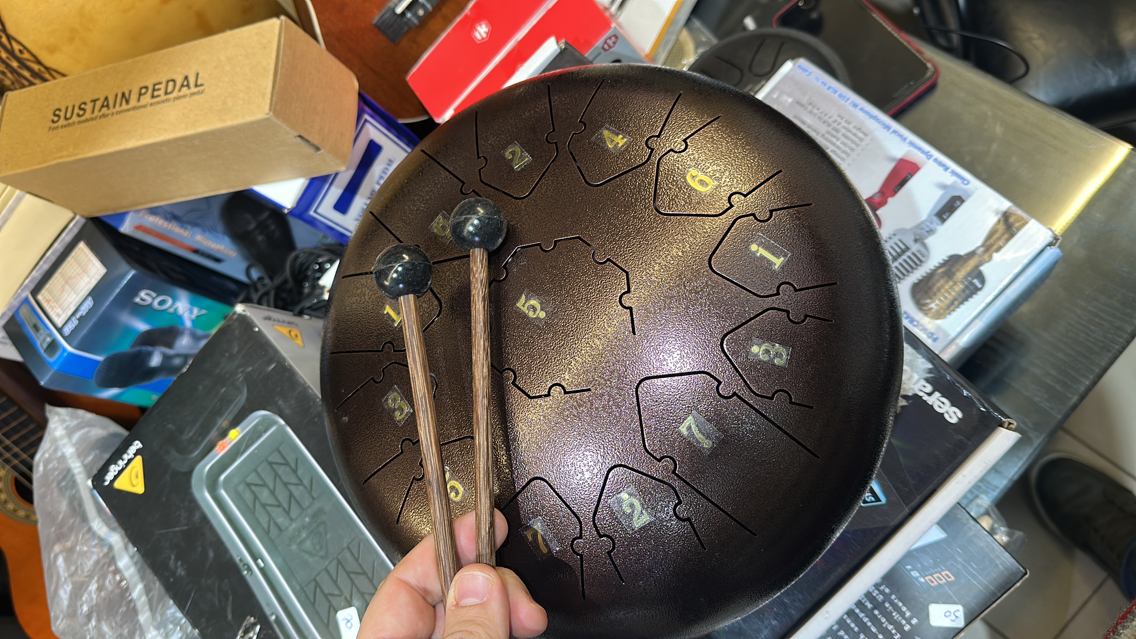 Brand New. Seven tuned metal tongues stamped with numbers (1–7 for scale degrees), producing a diatonic (often pentatonic or modal) scale. Solid high-carbon steel shell with raised tongues, typically played with included rubber-headed mallets. Commonly used for meditation or world-music textures.
